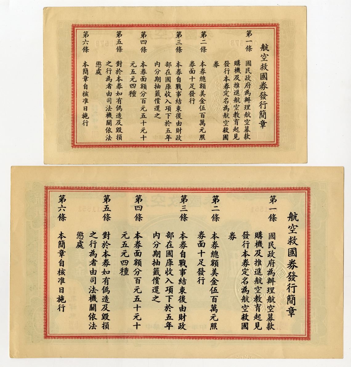 China...., 1941. Lot of 2 Overseas Chinese Patriotic Aviation Bond Issued in the Second Sino-Japanese War: $10 U.S. Dollars, S/M#H4-2, SB8132, Brown with pink underprint, S/N 053573 and $50 U.S. Dollars, S/M#H4-3 SB8133, Green on yellow underprint, S/N 011551. Notes range from AU to Uncirculated condition. (2). Sold "AS IS" no returns accepted. The Overseas Chinese Patriotic Aviation Bond was issued during the Second Sino-Japanese War (1937-1945) to raise funds for China's aviation sector, crucial in the fight against Japan. It targeted overseas Chinese communities, especially in Southeast Asia and North America, appealing to their patriotism. The funds helped purchase aircraft and support the Chinese Air Force. The bond campaign was successful, highlighting the strong ties between the Chinese diaspora and their homeland, and played a vital role in sustaining China's resistance against Japan during the war.