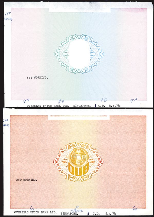 Singapore. “OUB” underprint for C.D. issued by company. Pink, light green and orange-tan underprint, From Bradbury Wilkinson Archives. Uncirculated with evidence of light thinning where removed from sample book. Typed archival text on bottom. Rare production proof. BWC.