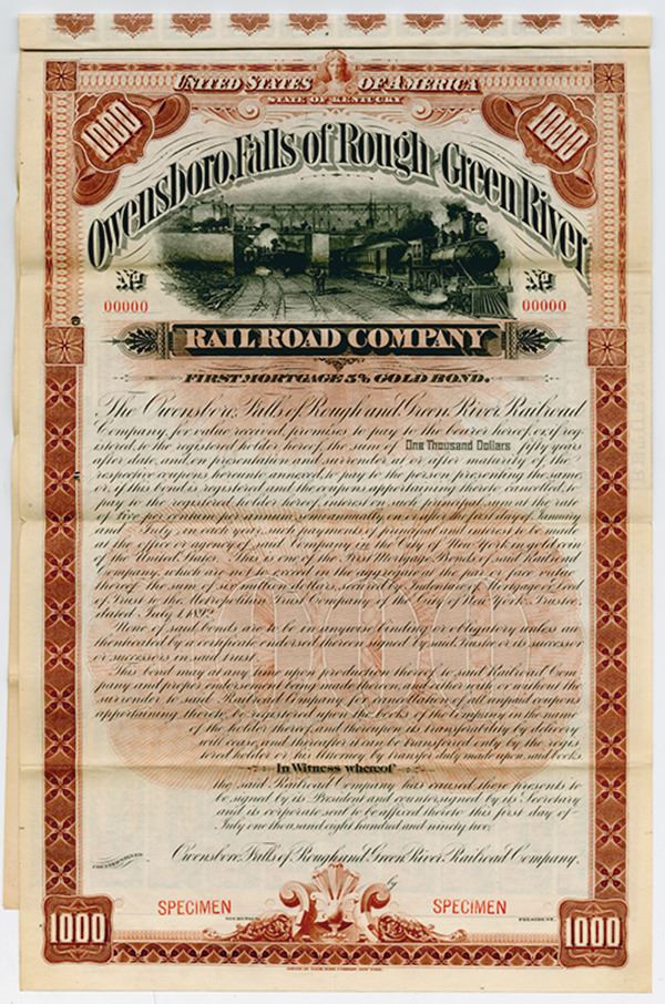 Kentucky, 1892 Specimen $1000 First Mortgage 5% Gold Coupon Bond, Black text with brown border and undertint, allegorical scene of two locomotives under signal towers. Red specimen overprints, POC's and "00000" serial numbers. VF-XF condition with specimen return stamp on back with minor discoloration, also on back, ABNC NY. There were only 2 examples found in the ABN Archives in 2002 and this is the only one available.