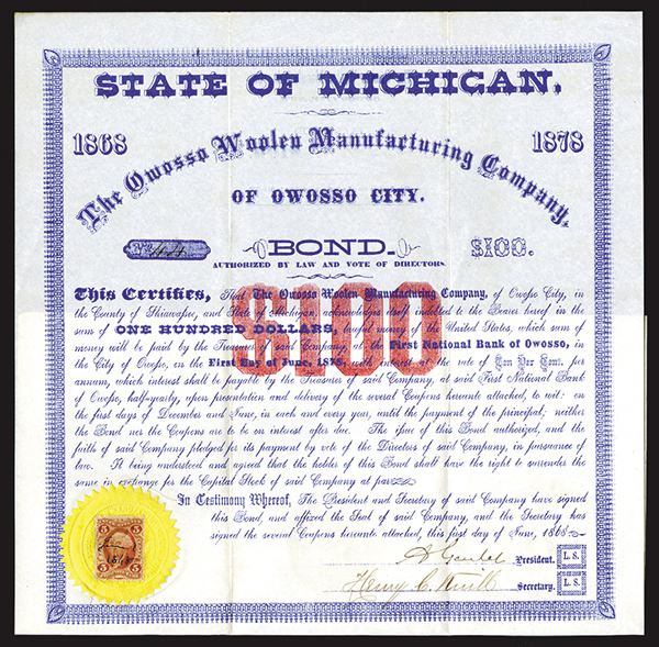 Michigan, $100, 10% Coupon Bond, I/U, Deep blue with red underprint, Yellow seal at left with revenue stamp, S/N 44, No vignette but very attractive, VF condition. Rare early Michigan certificate.