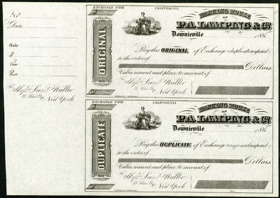 Downieville, California. 1860s, Uncut sheet of 2 Bills of Exchange with Original and Duplicate exchanges. Black print with simple black border. Vignette of seated allegorical figure at top left corner. VF-XF condition. (ex.NASCA 1983 "The Affleck Sale").