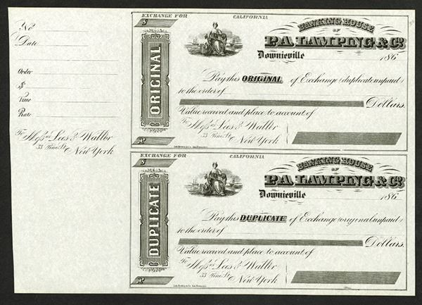 California. Uncut sheet of 2 exchanges with Original and Duplicate exchanges. Black print with simple black border. Vignette of seated allegorical figure at top left corner. VF-XF condition. (ex.NASCA 1983 "The Affleck Sale").