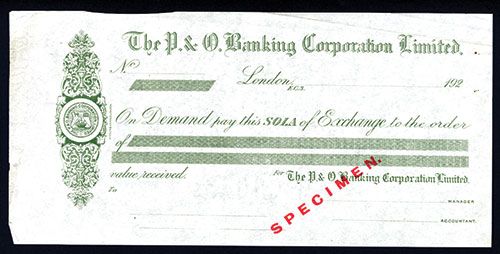China & India. Datelined: London, 192x, Specimen Sola of exchange, Arms at left on counterfoil, olive green on thin white paper, Red Specimen overprint, Choice XF to AU condition, P&O Banking Corporation was a bank established in 1920, by Peninsular and Oriental Steam Navigation Company to develop its private banking business. It was acquired seven years later (in 1927) by the Chartered Bank of India, Australia and China (now Standard Chartered Bank), and its businesses were amalgamated to the global operations of Chartered bank.