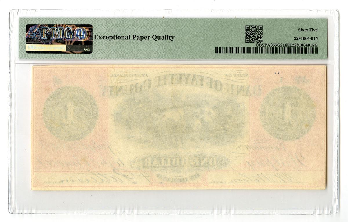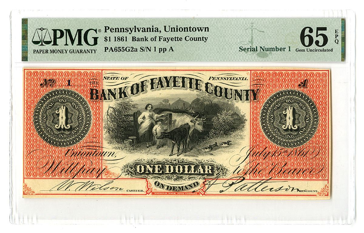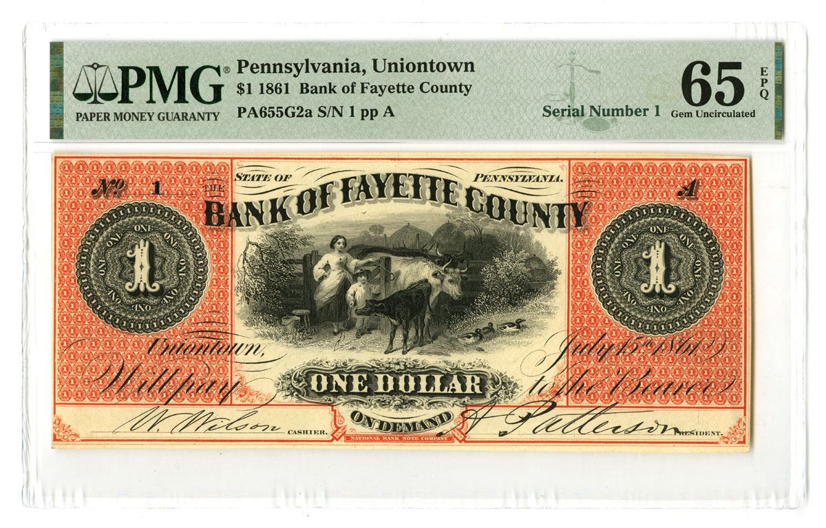 Uniontown, Pennsylvania. July 15, 1861, $1, PA-655-G2a, Issued Obsolete banknote, black on red borders and side panels, Serial Number 1, PMG graded 65 EPQ, The front of the note depicts an intricate and charming vignette, showing a woman and child standing beside a cow, with a rural landscape in the background, The signatures of M. Nelson (Cashier) and T. Patterson (President) are present, the note has a blank back, National BNC, printer.