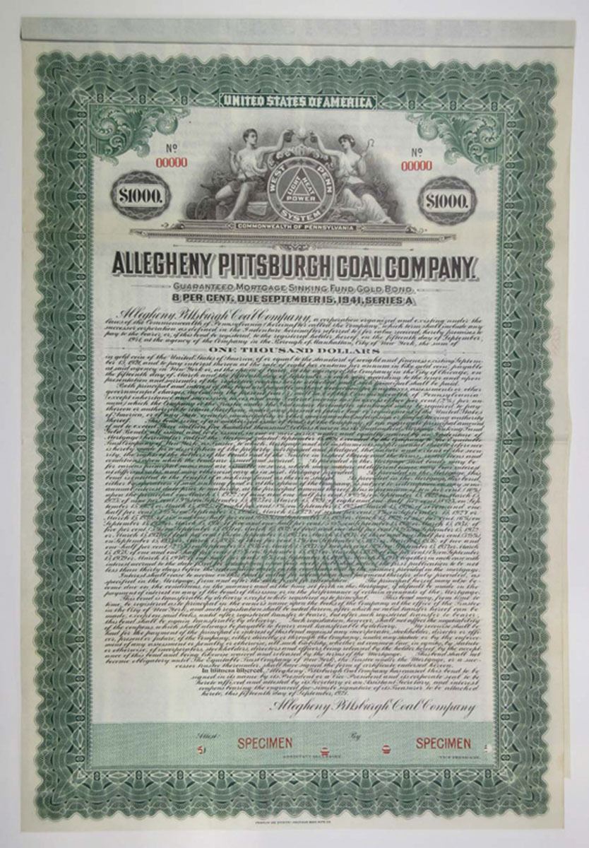 Pennsylvania. Allegheny Pittsburgh Coal Co. 1921 Specimen 8% Sinking Fund Gold Coupon Bond