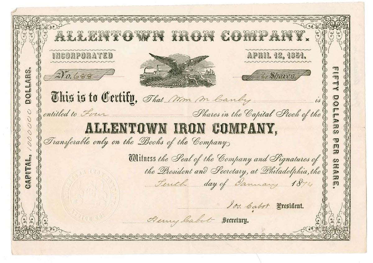 Allentown, Lehigh County, Pennsylvania. 1874, 4 Shares I/U Capital Stock Certificate, Black print on black border, small image of screaming eagle at top, VF-XF condition.