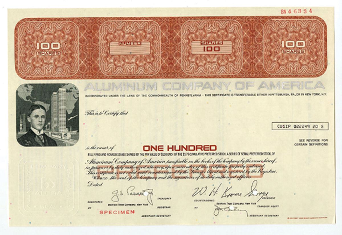 Aluminum Company of America. PA. 100 Shrs Stock Certificate. Specimen. Aluminum Company of America was incorporated in Pennsylvania.