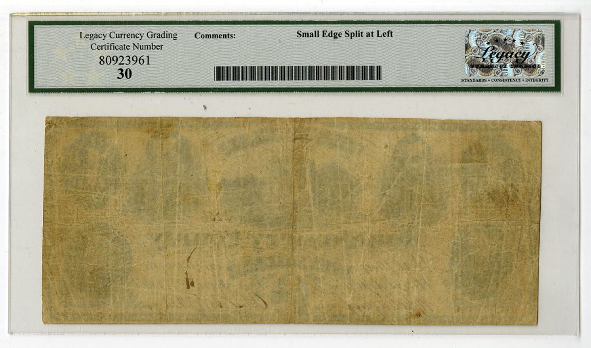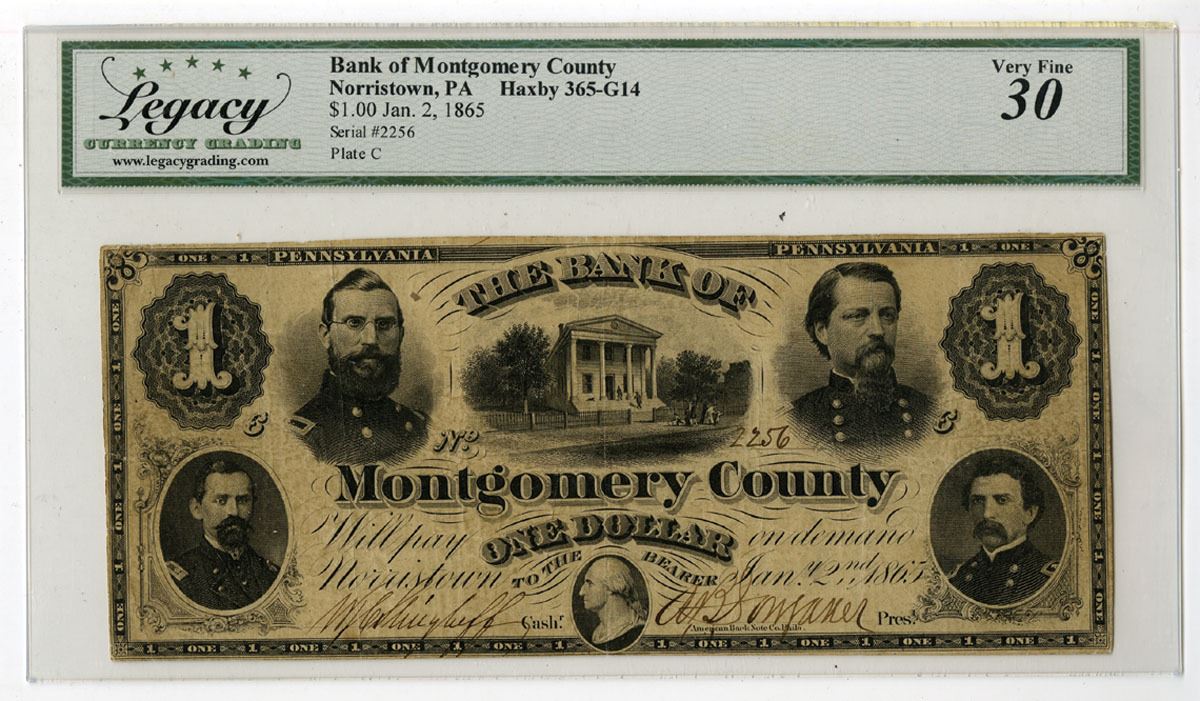 Norristown, Pennsylvania, January 2, 1865. $1, Haxby 365-G14, I/U Obsolete Banknote, Black printing with multiple portraits at left and right and house at top center, S/N 2256 pp C, Legacy graded Very Fine 30 with comment "Small Edge Split at Left," ABNC.
