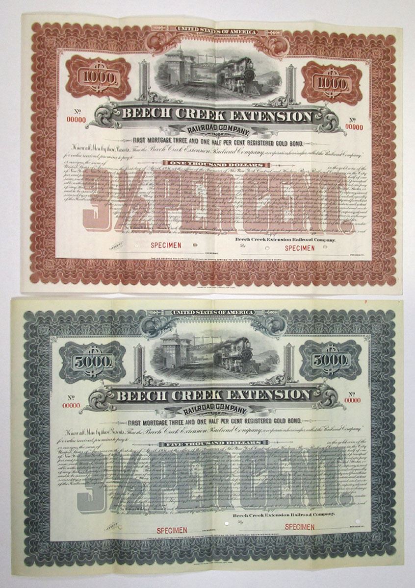 Pennsylvania, 1901. Lot of 2 Specimen Bonds, both are 3.5% First Mortgage Registered Gold Bonds, including: $1000 with brown border; and $5000 with blue border, both featuring a vignette of a train passing by switch towers at top center. All have Specimen overprints and POCs, and range from VF to XF condition. ABNC. (2). The blue $5000 Bond is unlisted in Cox.