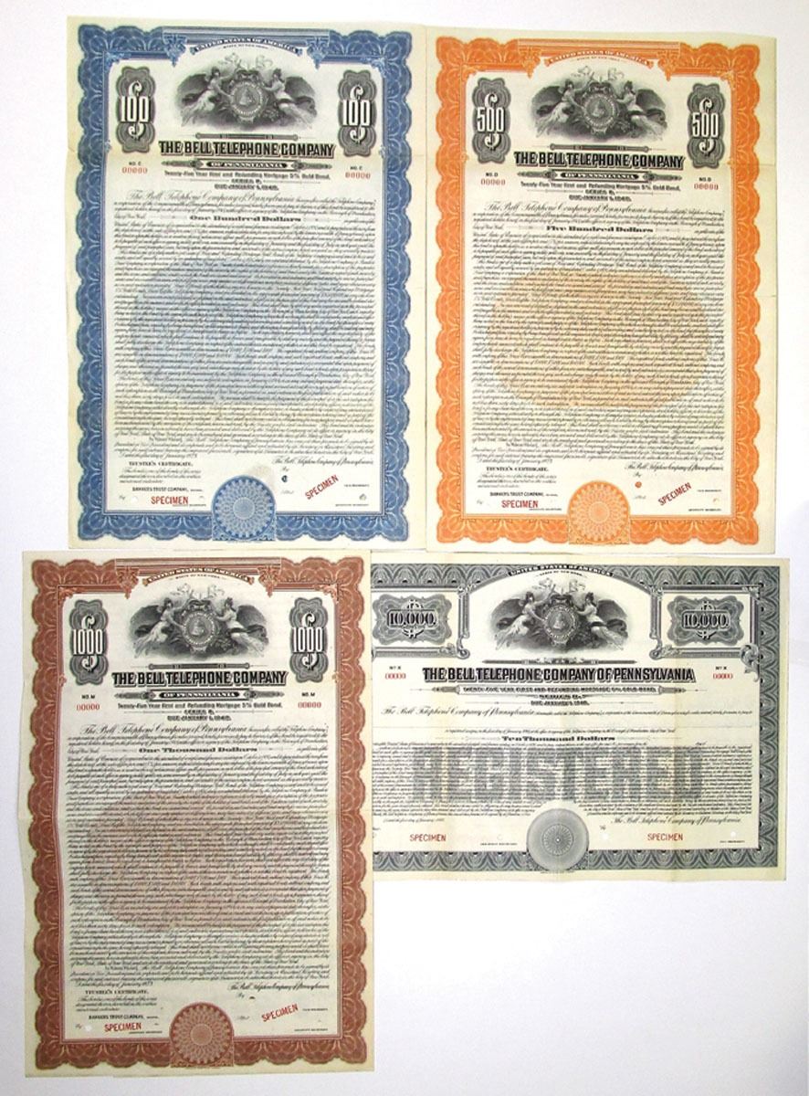 Pennsylvania. Lot of 4, 1923 dated Specimen 5% gold bonds, Includes $10,000 Registered 5% Gold Bond, VF, Black; $100, blue; $500 Orange; and $1000 Brown 5% Gold Coupon Bonds, All with allegorical angels flanking "Bell System" Logo in Middle, all with specimen overprints, POC's Red "00000" serial numbers and coupons attached. All in VF-XF condition. Attractive telephone company bonds. (4)