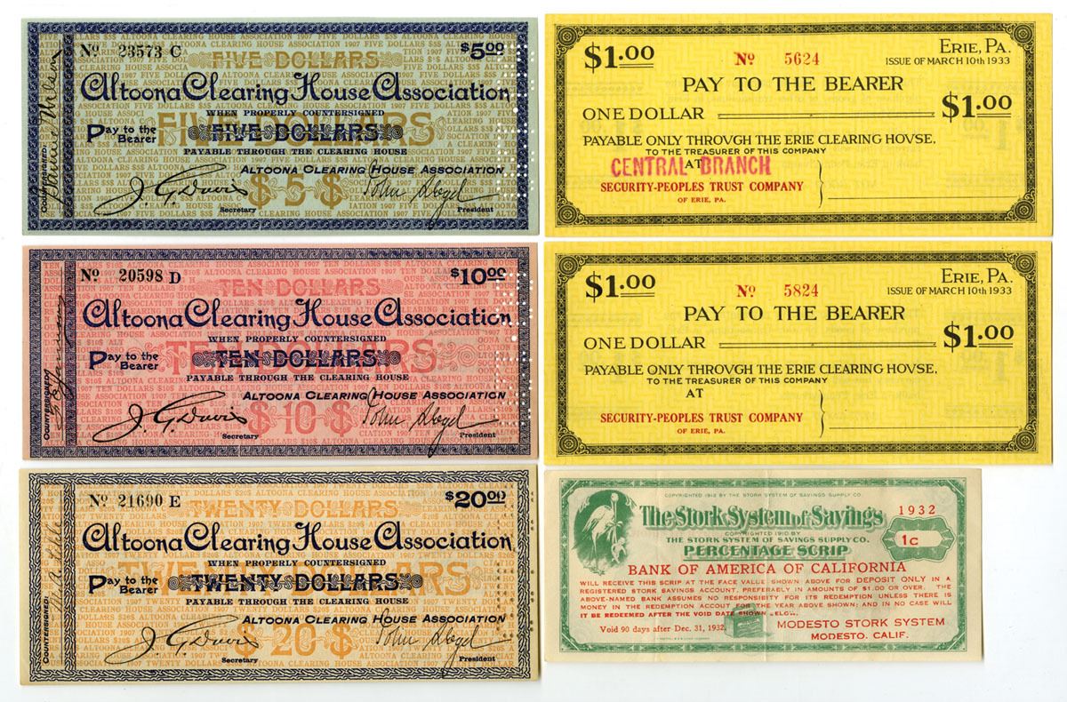 PA. and CA. , 1907 and 1933. Lot of 6 issued depression scrip and clearing house notes, The group includes Altoona, PA. Altoona Clearing House Association notes in $5, $10, and $20 denominations dated 1907; two Erie Clearing House $1 notes issued March 10, 1933; and, a 1932 Stork System of Savings 1 cent, percentage scrip issued for Bank of America of California. Notes feature ornate security borders, clearing house typography, and typical early 20th century emergency currency designs. Several display serial numbers, signatures of issuing officials, and printed redemption instructions. Notes range from Fine to CU condition overall. (6). Sold “AS IS” no returns accepted.