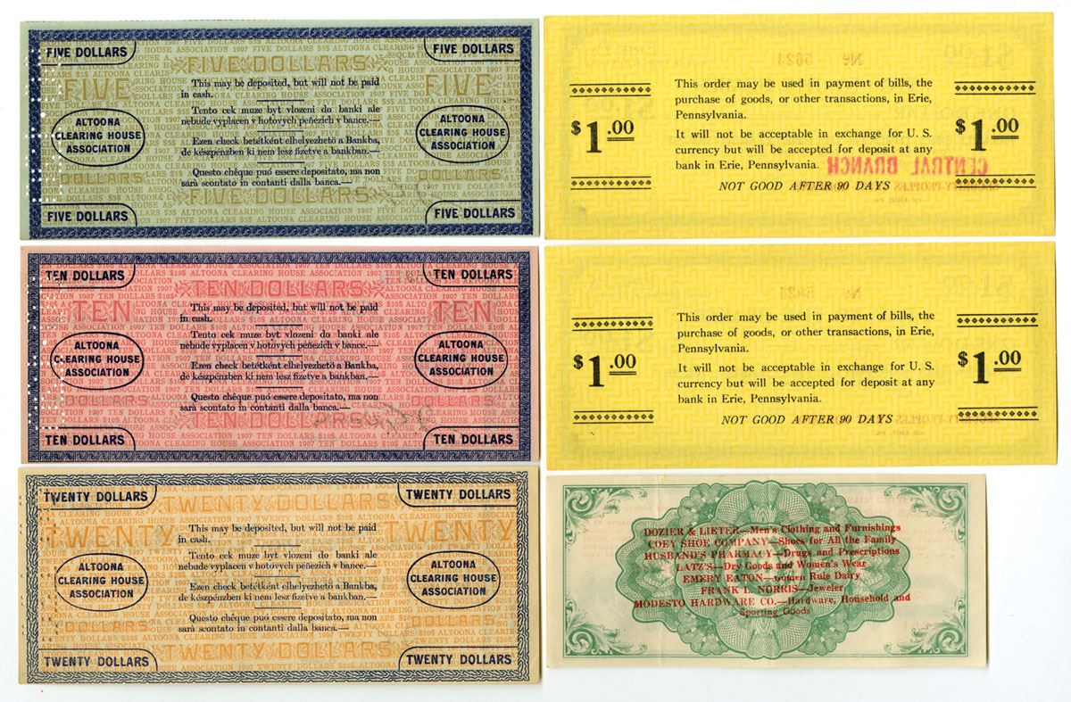 PA. and CA. , 1907 and 1933. Lot of 6 issued depression scrip and clearing house notes, The group includes Altoona, PA. Altoona Clearing House Association notes in $5, $10, and $20 denominations dated 1907; two Erie Clearing House $1 notes issued March 10, 1933; and, a 1932 Stork System of Savings 1 cent, percentage scrip issued for Bank of America of California. Notes feature ornate security borders, clearing house typography, and typical early 20th century emergency currency designs. Several display serial numbers, signatures of issuing officials, and printed redemption instructions. Notes range from Fine to CU condition overall. (6). Sold “AS IS” no returns accepted.