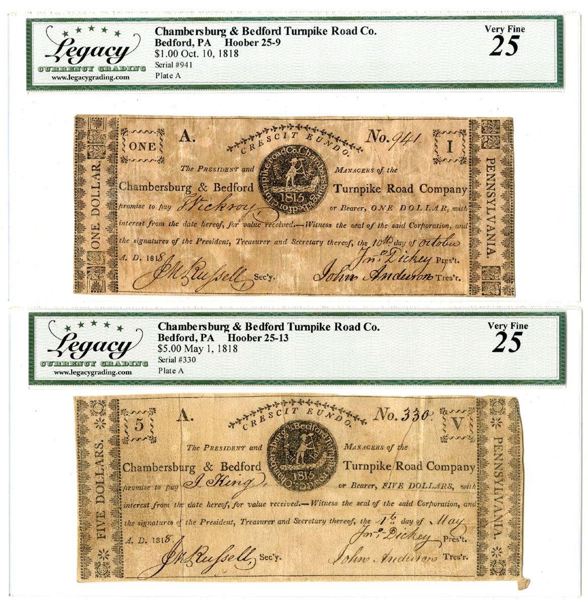 Bedford, Pennsylvania, 1818. Lot of 2 I/U Banknotes, Includes: October 10, 1818 $1, Hoober 25-9, S/N 941 pp A; May 1, 1818 $5, Hoober 25-13, S/N 330 pp A. Both notes are Legacy graded Very Fine 25 with comments "Minor Staining" and "Small Edge Tears at Top Left." (2). Sold "AS IS" no returns accepted.