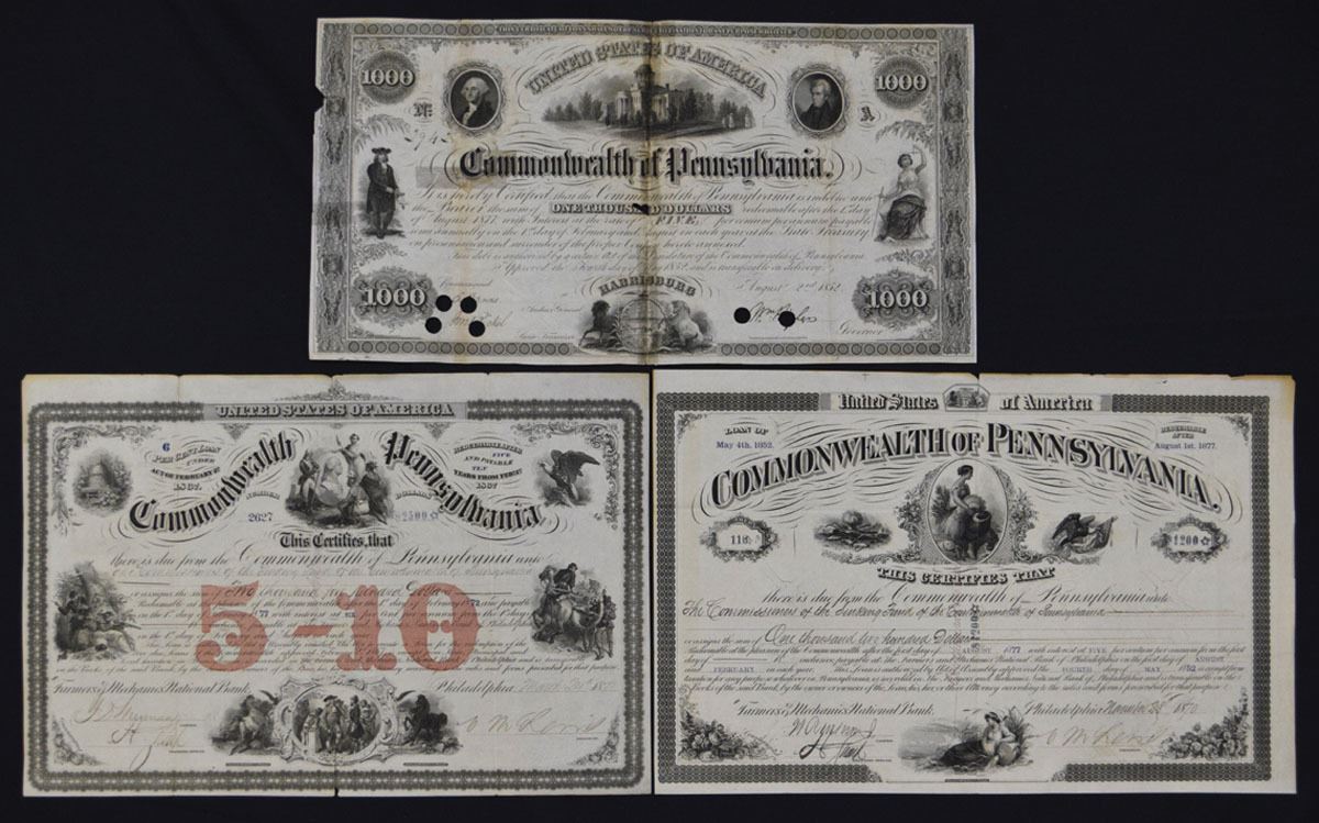 Pennsylvania......, 1852-72. Lot of 3 I/C Commonwealth of Pennsylvania Loan Certificates representing state-issued public debt obligations, each with ornate engraved designs, allegorical vignettes, and classical portrait medallions. All are $1000 denominations and are either cut cancelled or hand written cancelled. Fine to VF+ condition. (3). Sold “AS IS” no returns accepted.