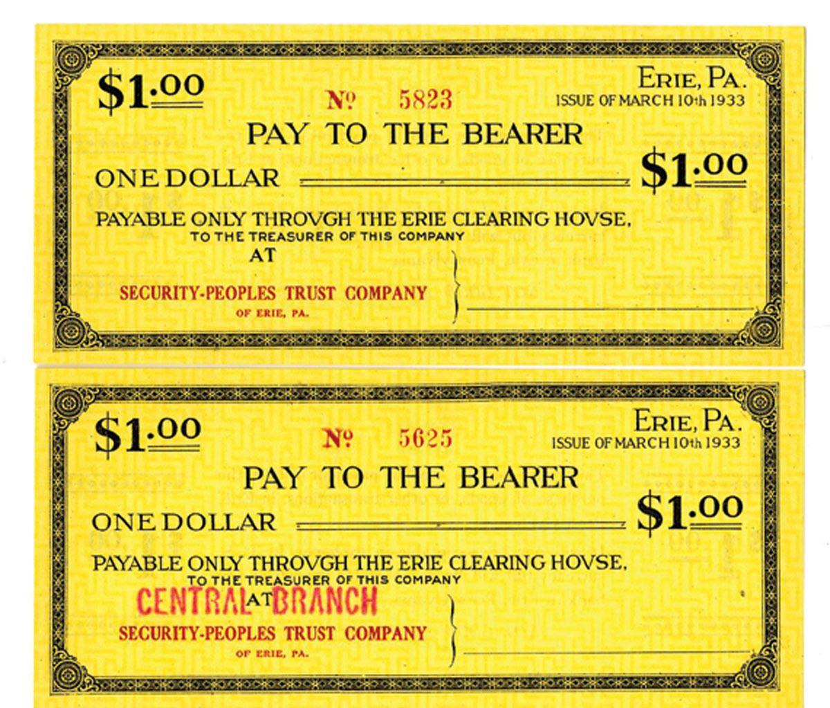 Erie, PA. Erie Clearing House, 1933. $1 Depression Era Bearer Scrip Notes (2). Unc to CU condition.