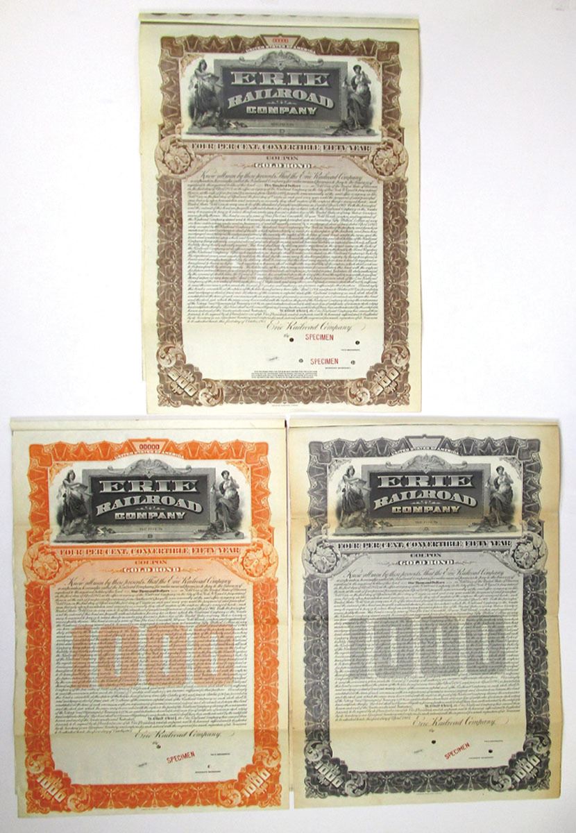 Pennsylvania, 1903-1915, Lot of 3 Specimen Bonds, Includes: 1903, $1000 4% Convertible Fifty Year Gold Coupon Bond, Black with gray border; 1905, $1000 4% Convertible Fifty Year Gold Coupon Bond, Black with orange border; 1915, $1000 4% Convertible Fifty Year Gold Coupon Bond, Black with brown border. All have allegorical figures flanking company title at top center, Specimen overprints, POCs, are in Fine to VF condition with archival reinforcements, printed by ABNC. (3). All 3 are known as specimens only, no issued examples known, all are rare.