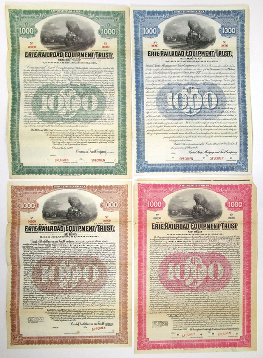 Pennsylvania, 1920-1929, Lot of 4 Specimen Bonds, Includes: 1920, $1000 6% Series FF Coupon Bond, Black with blue border; 1922, $1000 5 1/2% Series CC Coupon Bond, Black with green border; 1928, $1000 4 1/2% Coupon Bond, Black with brown border; 1929, $1000 4 1/2% Coupon Bond, Black with pink border. All have same vignette of train coming down the tracks, Specimen overprints, POCS, are in Fine to VF condition with archival reinforcements, printed by ABNC. (4). Only the Series "GG" bond is listed in Cox, all of the others are unlisted, all rare, with either 1 or 2 examples known at the most for each, all known as specimens only.