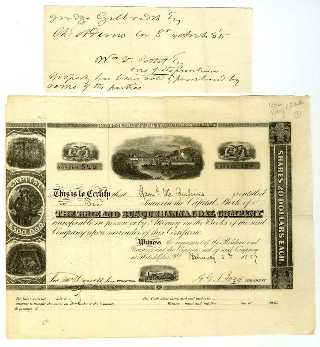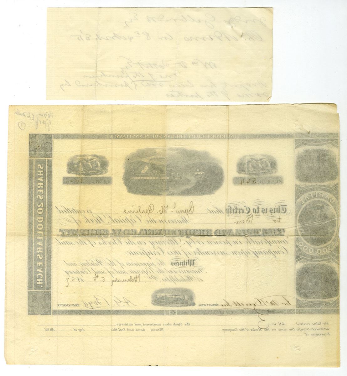 Pennsylvania…., 1857. 10 Shares I/U Stock Certificate, Black print with black border, Vignettes at top center and along left side include Benjamin Franklin and Seal of Pennsylvania, S/N 544, VF condition.