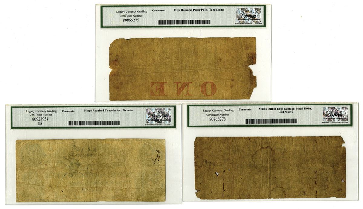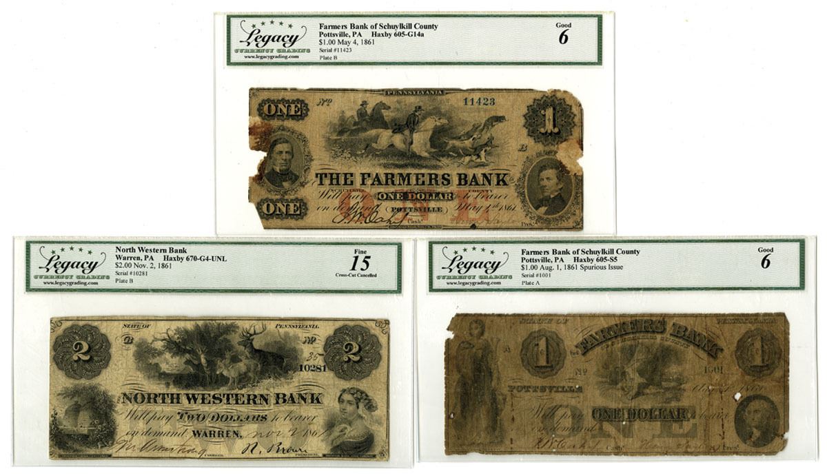 Pennsylvania, 1861. Lot of 3 Banknotes, Includes: May 4, 1861, Farmers Bank of Schuylkill County, Pottsville PA $1, Haxby 605-G14a, I/U Banknote, Legacy graded Good 6 with comments "Edge Damage; Paper Pulls; Tape Stains," ABNC; August 1, 1861 $1, Haxby 605-S5, Spurious I/U Banknote, Legacy graded Good 6 with comments "Stains; Minor Edge Damage; Small Holes; Rust Stains," UBNC; November 2, 1861, North Western Bank, Warren PA $2, Haxby 670-G4-UNL, I/C Banknote, Legacy graded Fine 15 with comment "Hinge Repaired Cancellation; Pinholes," NBNC. (3). Sold "AS IS" no returns accepted.