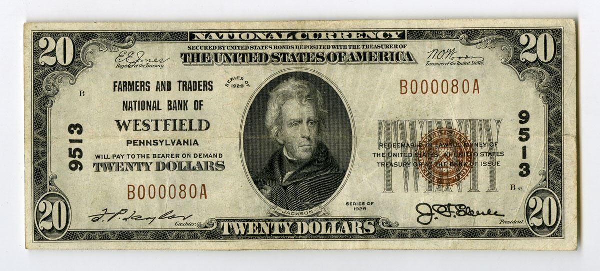 Westfield, Pennsylvania, 1929. $20, Series of 1929, Ch#9513, Jones | Woods Signatures, Brown seal at right, S/N B000080A pp B47/71, VF to XF condition. Only 1 previous example of the $20 T1 is known, this being the second example and possibly the highest condition out of the pair. Rare.