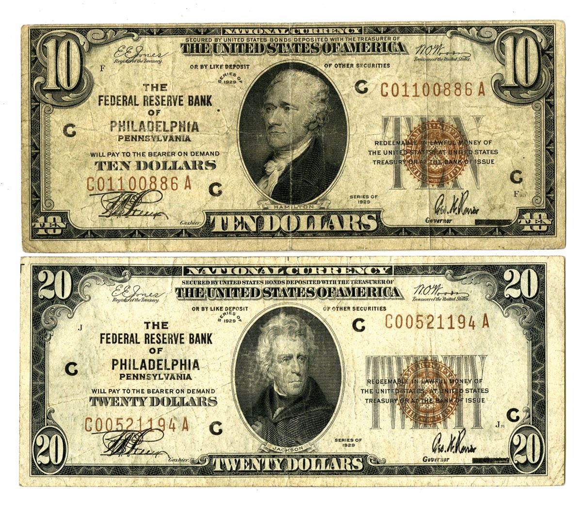 Philadelphia, Pennsylvania, 1929. Lot of 2 Issued Banknotes, Includes: $10, P-396, Series of 1929, Fr.# 1860-C, S/N C01100886A pp F217/270; $20, P-397, Series of 1929, Fr.# 1870-C, S/N C00521194A pp J71/52. Both notes have Jones | Woods Signatures, Brown seals at right, and range from Fine to VF+ condition. Attractive banknote pair.