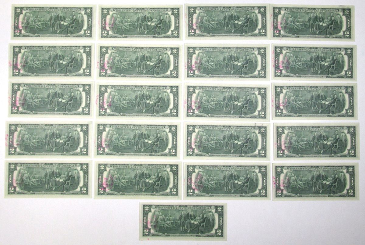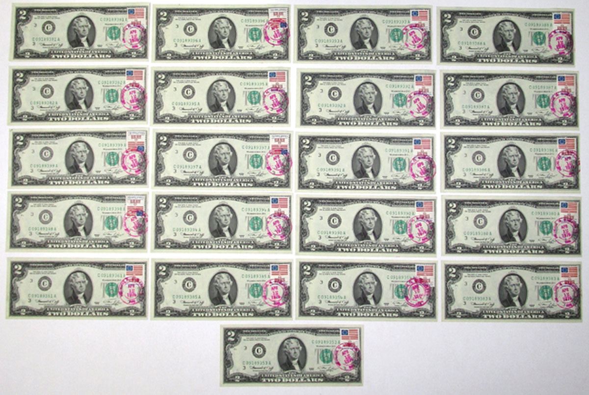 Philadelphia, Pennsylvania, 1976. $2, P-461 (21), Fr.# 1935C, Issued Banknote Collection with First Day Cancel (April 12, 1976) and Bicentennial Era State Stamps, Black print with Jefferson at center and green seal at right, Back shows signing of the Declaration of Independence by Trumbull, Neff | Simon signatures, Notes are in Uncirculated to Gem Uncirculated condition. (21). Sold "AS IS" no returns accepted.