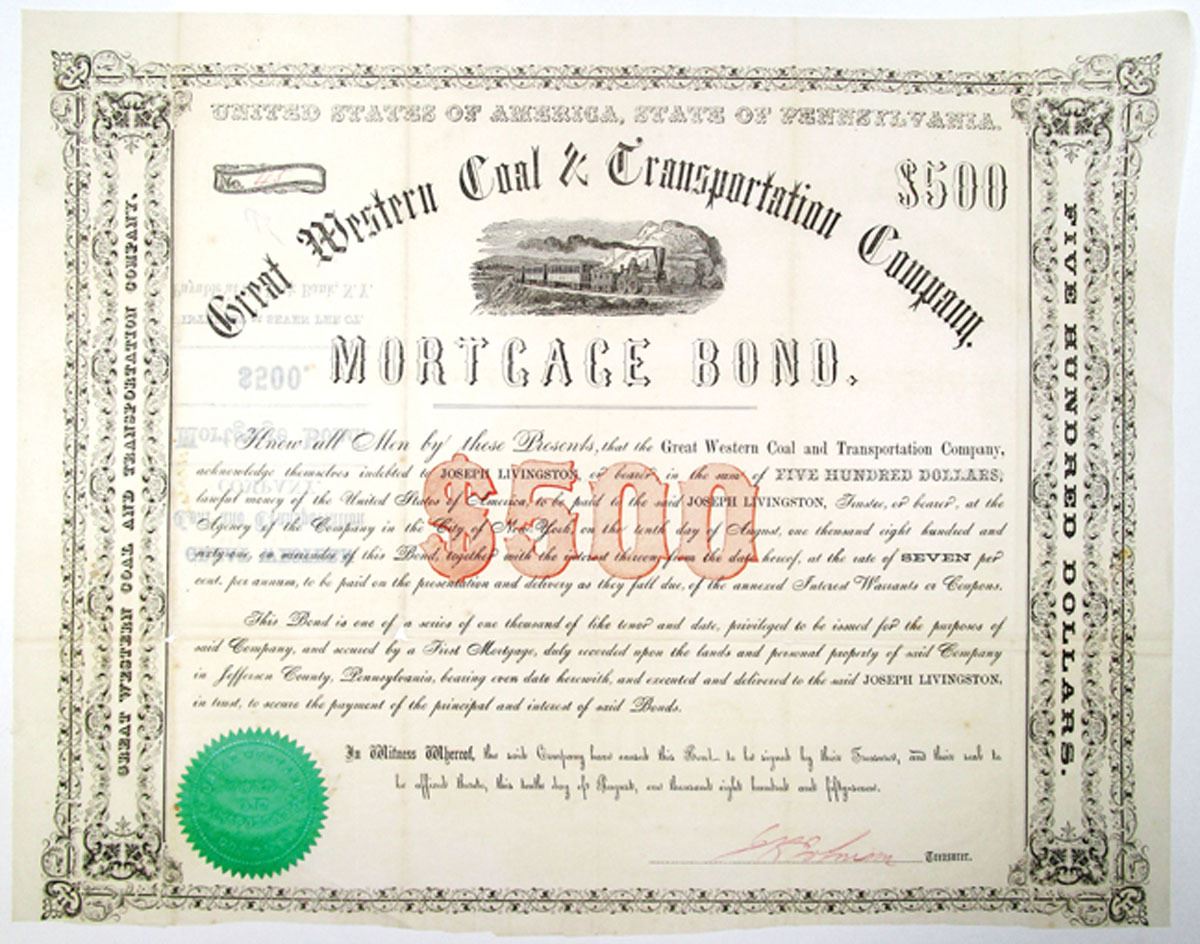 Pennsylvania, 1857. $500 I/U 7% Mortgage Bond, S/N 45, Black text with black border and red underprint, Train passing on mountain curve at top center. Fine condition with some small holes along fold lines, as well as some staining. Rare bond in Cox.