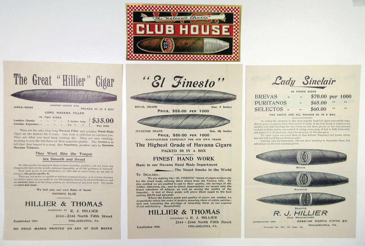 Philadelphia, PA. 1905. Lot of 4 cigar advertising items, Includes: 3 Illustrated Cigar Advertisements (approximately 8.5 × 5.5 inches) issued by Hillier & Thomas, successors to R. J. Hillier. Advertisements promote El Finesto, Lady Sinclair, and The Great “Hillier” cigars, each illustrated with detailed cigar renderings and period pricing and branding text emphasizing Havana-made production. Also included is an embossed cigar box label (approximately 6.5 × 2.5 inches) for Club House cigars, featuring bold color, gold embossing, and a central cigar vignette. Printed on period paper stock with strong visual appeal throughout. Conditions are VF overall, with light toning and minor handling typical of commercial ephemera. An attractive and increasingly scarce group of American cigar advertising material. (4). Sold "AS IS" no returns accepted.