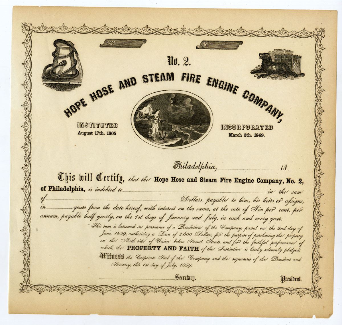 Philadelphia, Pennsylvania, 1859. Unissued Bond, Black print on black border and no underprint, Firehose at top left and dog at top right corners, Allegorical woman by stormy shore at center under title, XF-AU condition.