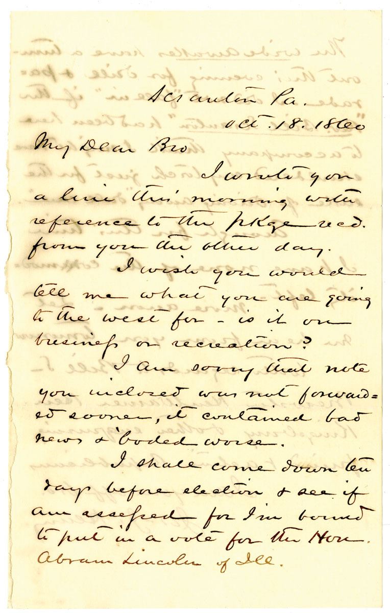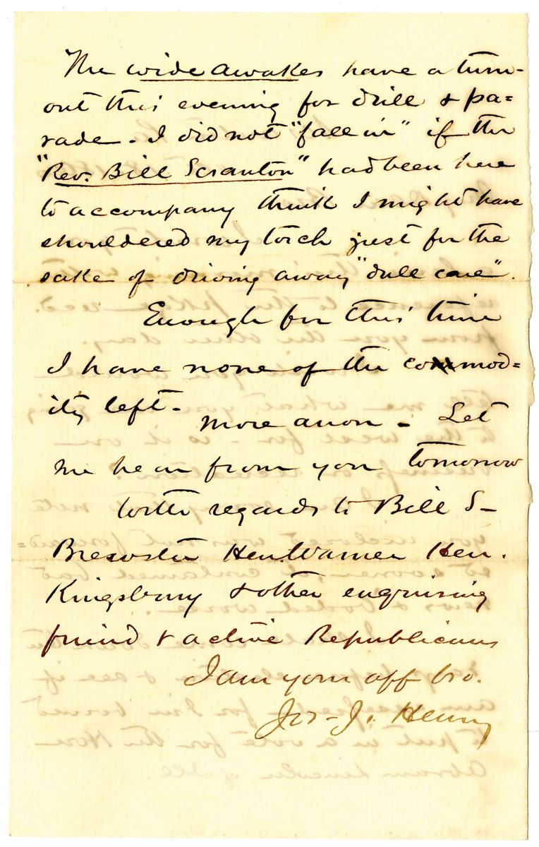 Scranton, Pennsylvania, October 18, 1860. Fascinating 2-page handwritten letter with rich political content. The author, Joseph J. Henry, writes that "I shall come down ten days before election & see if am assessed for I'm bound to put in a vote for the Hon. Abraham Lincoln of Ill." This piece goes on to say that "The Wide Awakes have turned out this evening for drill & parade." The Wide Awakes were a youth organization and later a paramilitary organization cultivated by the Republican Party during the 1860 presidential election in the United States. The group supported Lincoln, and were used by the Lincoln campaign to spearhead large voter registration drives since they knew that new voters and young voters tend to embrace new and young parties. Incredible first-hand account of voting for Abraham Lincoln, one of the United States' greatest leaders.
