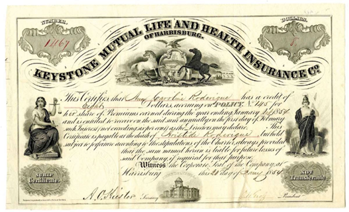 Harrisburg, PA. 1854, $8, Issued certificate, Allegorical Justice and Liberty flank Pennsylvania arms, VF condition, TCC&C. Attractive insurance certificate.