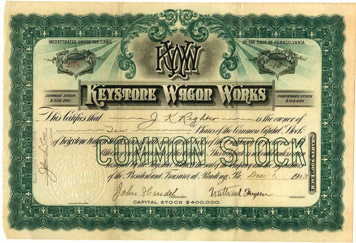 Reading, Pennsylvania. 10 Shares Common Capital Stock Issued Certificate, Black print on green border, Company initials at top over company title, VF condition with toning over certificate and splitting along fold lines condition. Historic early wagon manufacturer.