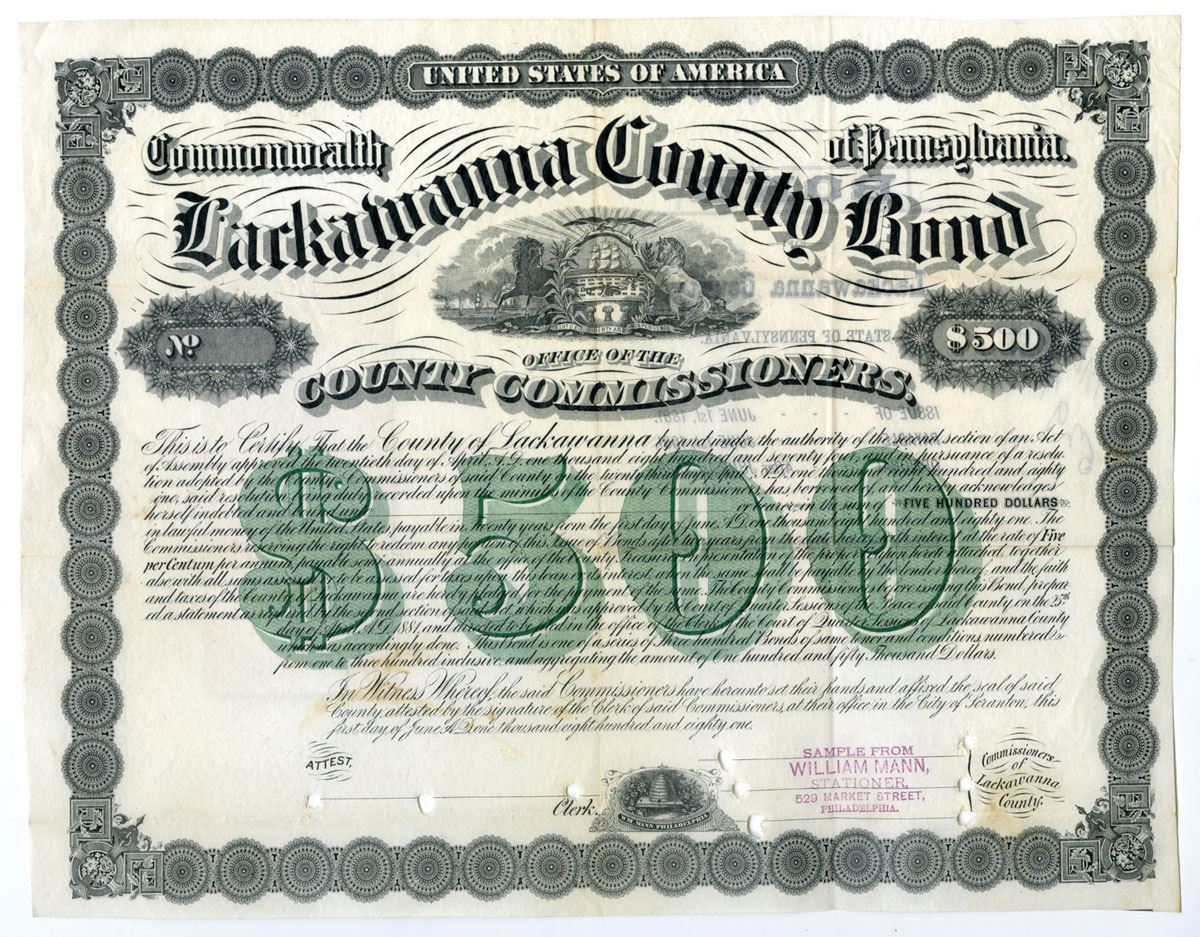 Scranton, Pennsylvania…... 1881. $500 Specimen 5% Bond, Black print with black border and green underprint, Seal of Pennsylvania at top under title at center, 'Sample' stamp and POCs along bottom, VF to XF condition with minor stains at center.
