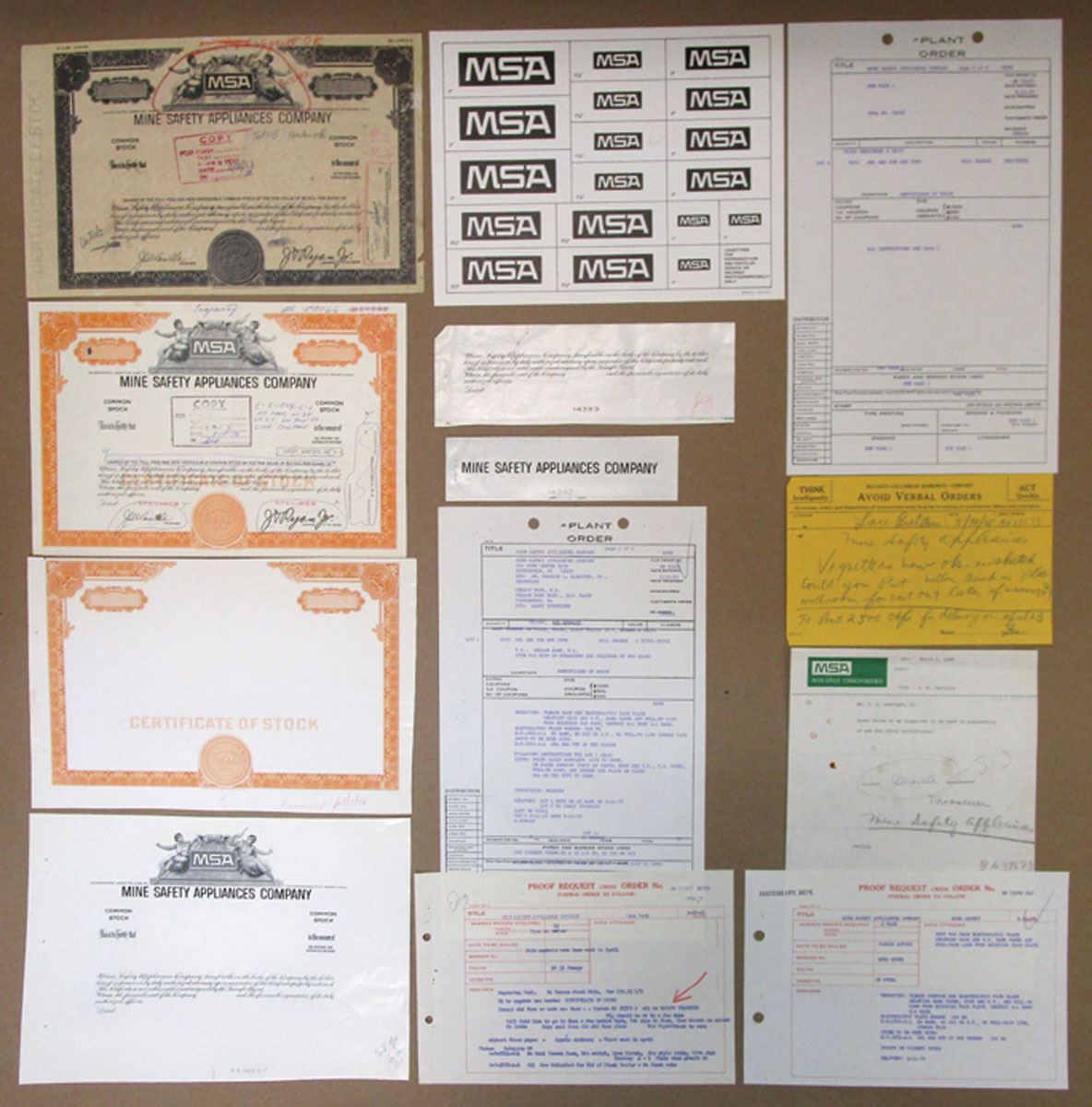 Pennsylvania, 1960s. Production file from Security-Banknote Co. Archives, File includes mock ups, samples, order forms and more. VF to CU condition. (13). Mine Safety Appliances, or MSA Safety Incorporated, is an American manufacturer and supplier of safety equipment designed for use in a variety of hazardous conditions in industries such as construction, the military, fire service, and chemical, oil, and gas production. It was founded in 1914 after development of the Edison Safety Mining Lamp by mining engineer John T. Ryan Sr. and George H. Deike with help from Thomas Edison following a terrible mine explosion in West Virginia in 1912. The mining lamp was a battery-powered headlamp for miners to help prevent methane-related explosions caused by open flame lamps. Today, only a small portion of the company's current products involve mining related products.