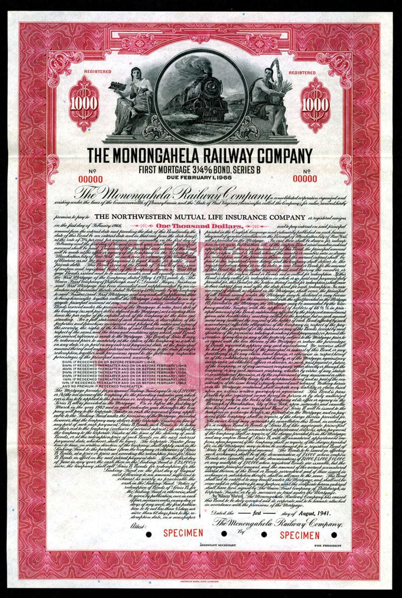 Monongahela Railway Co., 1941 $1000 Specimen 3.25% 1st Mortgage Bond, VF ABN Red. Pennsylvania. Payable to the Northwestern Mutual Life Insurance Company. First Mortgage 3 1/4% Specimen Bond, Series B, red frame and underprint, train in circular frame , flanked by a seated man and woman, ABNC, EF.