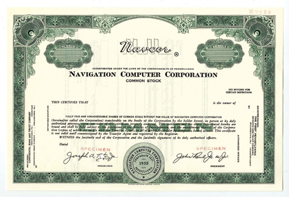 PA. NAVCOR, Navigation Computer Corp. 1955 Specimen Stock Certificate XF SCBN. Navigation Computer Corp was incorporated in Pennsylvania in 1955.