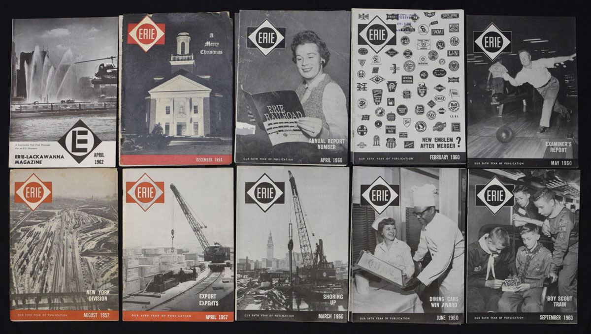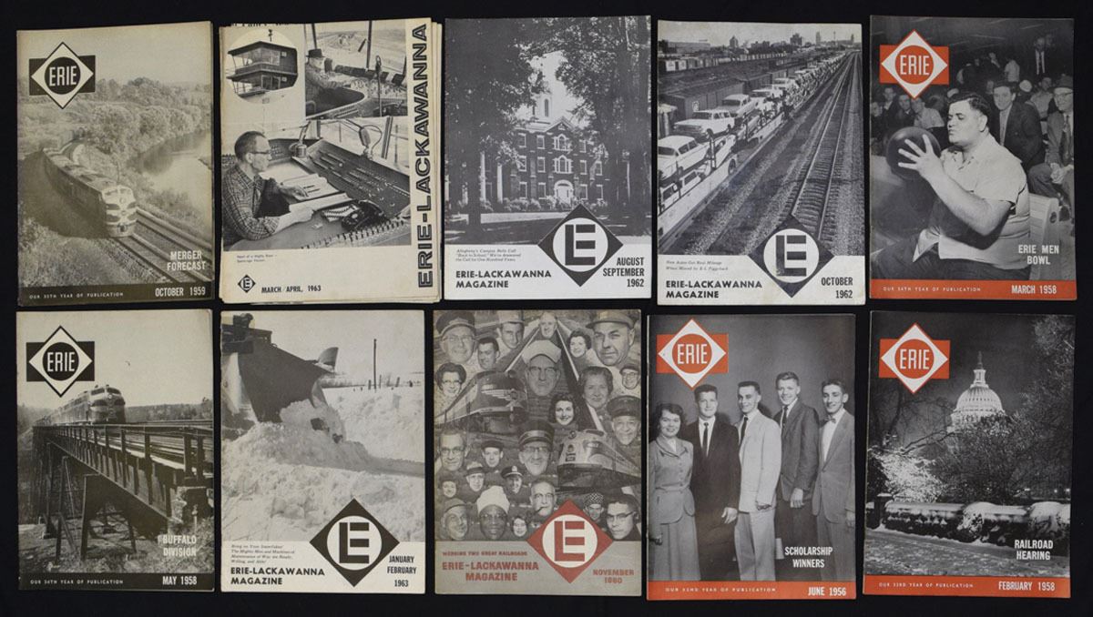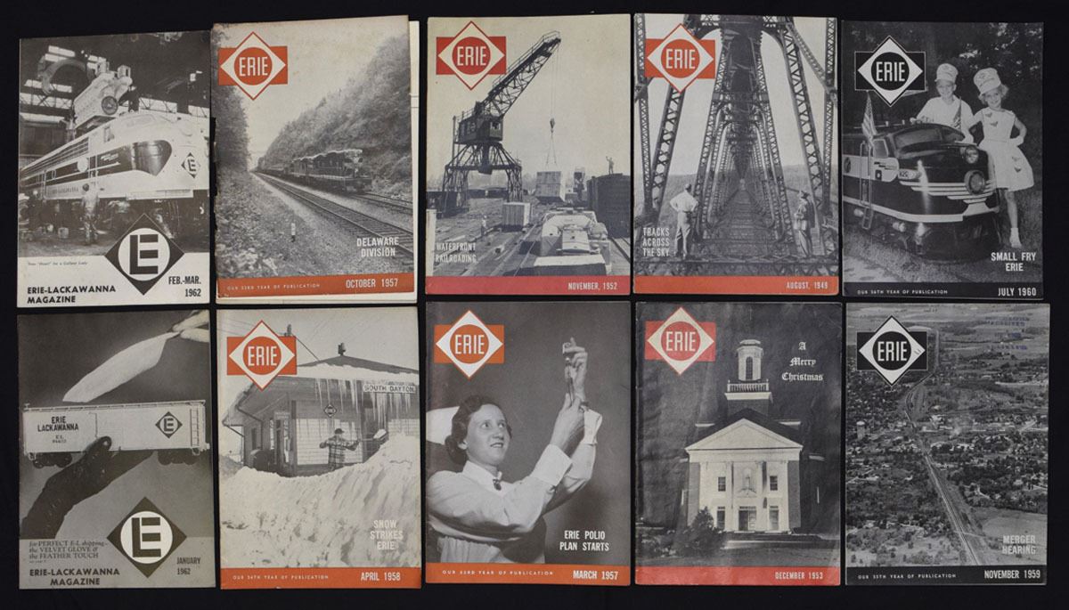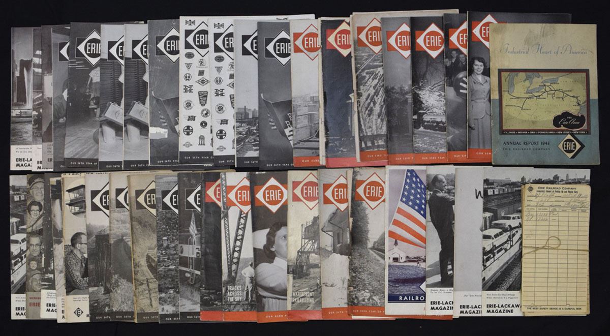 PA. NJ......, Lot of 45+ magazines, featuring a substantial run of Erie Railroad and Erie-Lackawanna employee and public relations magazines along with company annual reports and related railroad ephemera, including Erie Railroad magazines from the 1950s and early 1960s featuring covers with railroad operations, company events, and industrial scenes, Erie-Lackawanna magazines from 1962 and 1963 highlighting the merger era and modernization efforts, Erie Railroad annual reports including the Industrial Heart of America 1943 publication, an Erie Railroad receipt, and additional railroad-issued publications, offering a rich and visually appealing archive documenting the mid-20th century history of a major American railroad. (45+). Sold "AS IS" no returns accepted. (Garden State Railroad Collection).