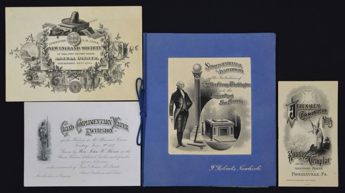 Pennsylvania, and New York, 1880s. Lot of 4 Printed Programs and Souvenir cards relating to American fraternal and historical-patriotic organizations, including: New England Society of New York Annual Dinner of 1881, with elaborate engraved vignettes, Engraved by Tiffany & Co.; Grand Complimentary Water Excursion for Union Veterans & Families, June 9, 1882, Excursion Card, engraved by Homer Lee BNC; Sesqui-Centennial Masonic Celebration of the Initiation of George Washington into the Fraternity of Free Masons, Engraved and printed by E.A. Wright, 1902; and, Jerusalem Commandery No. 15 Knights Templar Reception Program, Phoenixville, PA (1913–14), Printed by E.A. Wright. Designs feature detailed allegorical engravings, patriotic and Masonic iconography, and scenes of historical events. Conditions range from XF to Almost New condition with light handling. (4). Sold “AS IS” no returns accepted.