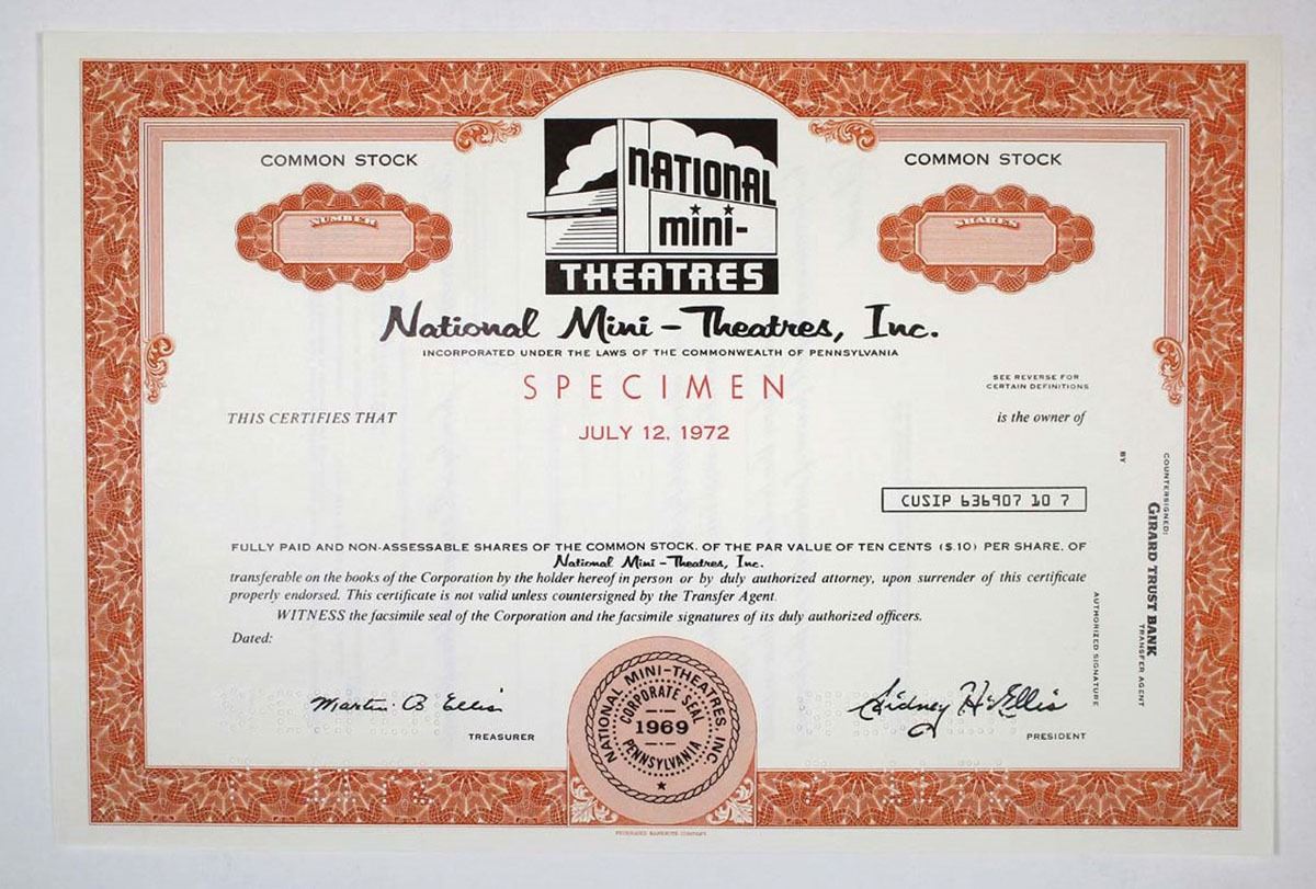 Pennsylvania. National Mini-Theatres, Inc., 1972. Specimen Stock Cert, AU-Unc. FBNC