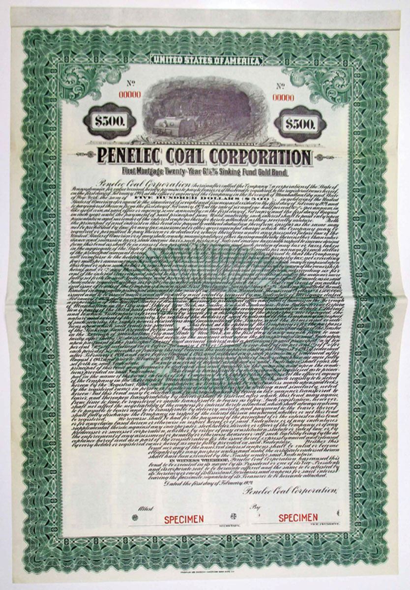 PA. Penelec Coal Corp., 1924 $500 Specimen 6.5% Gold Coupon Bond, VF FLBN Green. The Penelec Coal Company was organized to purchase mines at or near the various power plants for Penn Public Service, and in 1919 it was merged back into Penn Public Service for easier management.