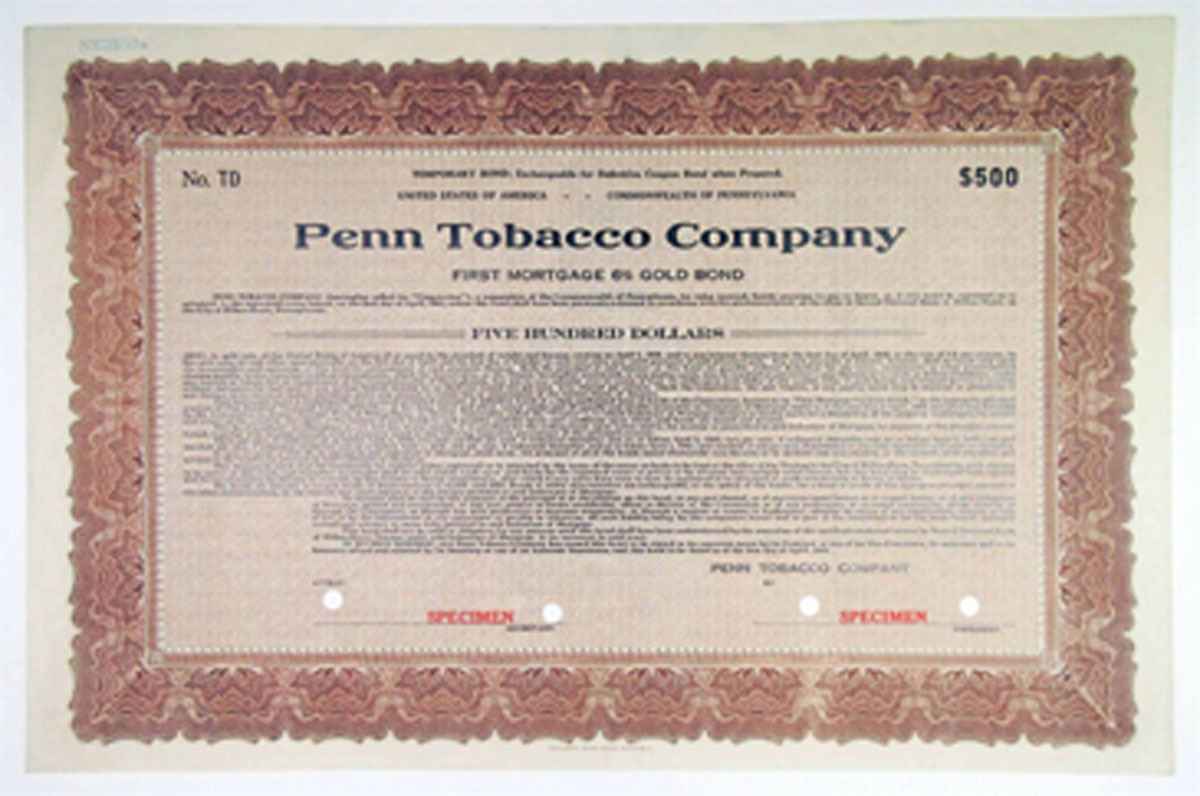 Pennsylvania. $500 Temporary Bond Specimen. Security BNC. Extremely Fine.