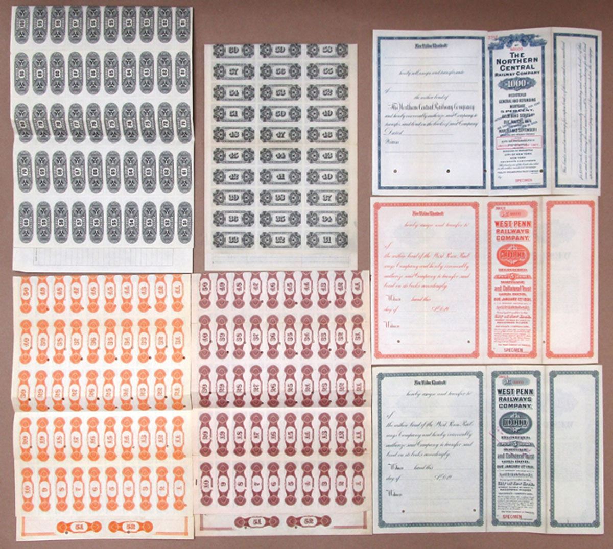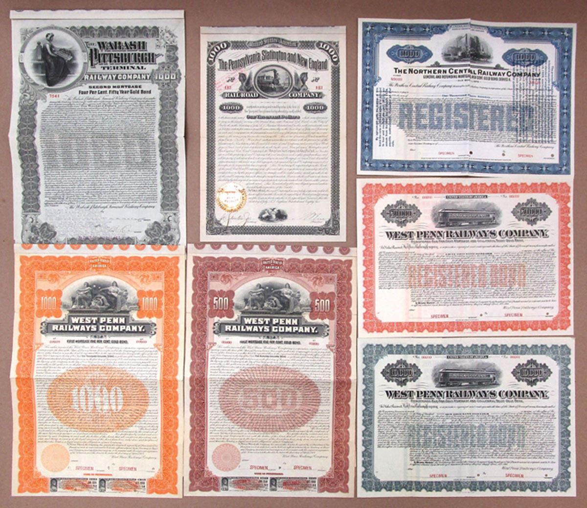 Pennsylvania, 1882 to 1924. Lot of 7 I/U and Specimen Bonds, Includes: 1882, $1000, Pennsylvania, Slatington and New England Railroad Co. I/U Coupon Bond; 1910, Wabash Pittsburgh Terminal Railway Co., $1000, I/U, Coupon Bond; 1933, $1000, Northern Central Railway Co. Specimen Registered Bond with "Going off the Gold Standard Claus overprint on re-issued 1924 Registered bond"; West Penn Railways Co., includes 1910, $10,000 and $50,000 Specimen Registered Bonds (2), and,1905, $500 and $1000 Specimen Coupon Bonds (2). Specimens are marked with overprints or pin punches and range from VF to XF condition, printed by ABNC. (7). Sold "AS IS" no returns accepted.