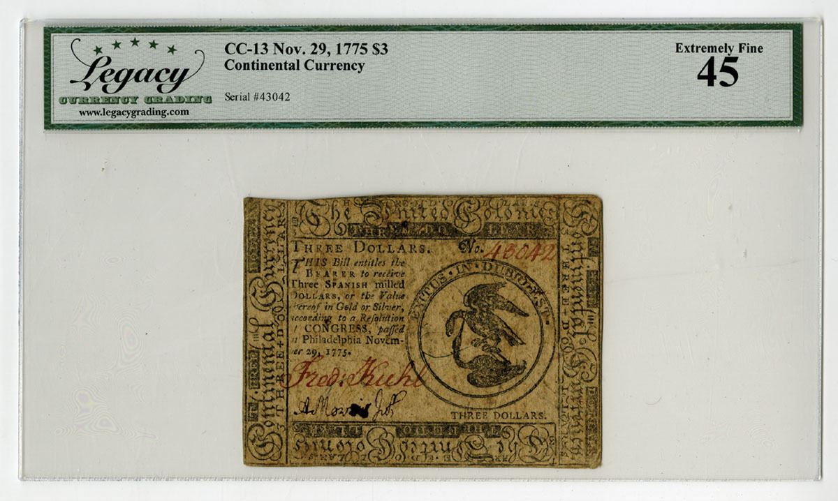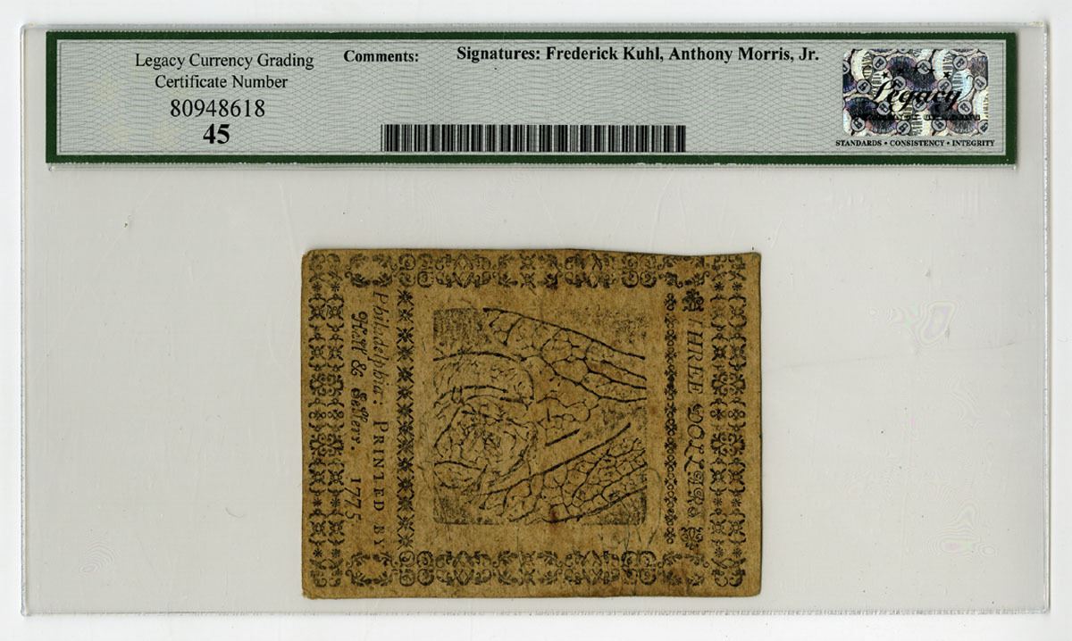 Pennsylvania, November 29, 1775. $3, CC-13, P-S113, Issued Banknote, Black printing with 'Exitus in Dubio Est' on emblem with an eagle attacking a heron at right, Back has skeletonized elm and maple fruit leaves, S/N 43042, Signed by Frederick Kuhl and Anthony Morris Jr., Legacy graded Extremely Fine 45, Hall & Sellers.