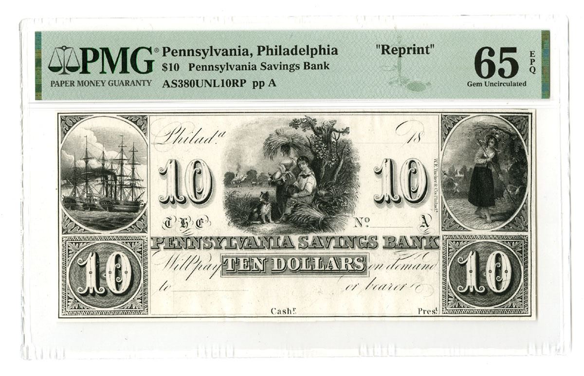 Philadelphia, Pennsylvania, 18xx, ca.1830-50). $10, AS380UNL10RP pp A, Proprietary-Reprint proof obsolete banknote, Black and white printing with children at center and other vignettes at left and right, Uniface note, PMG graded Gem Uncirculated 65 EPQ, W. E. Tucker & Co. Extremely rare note with no similar examples found to be offered at auction.