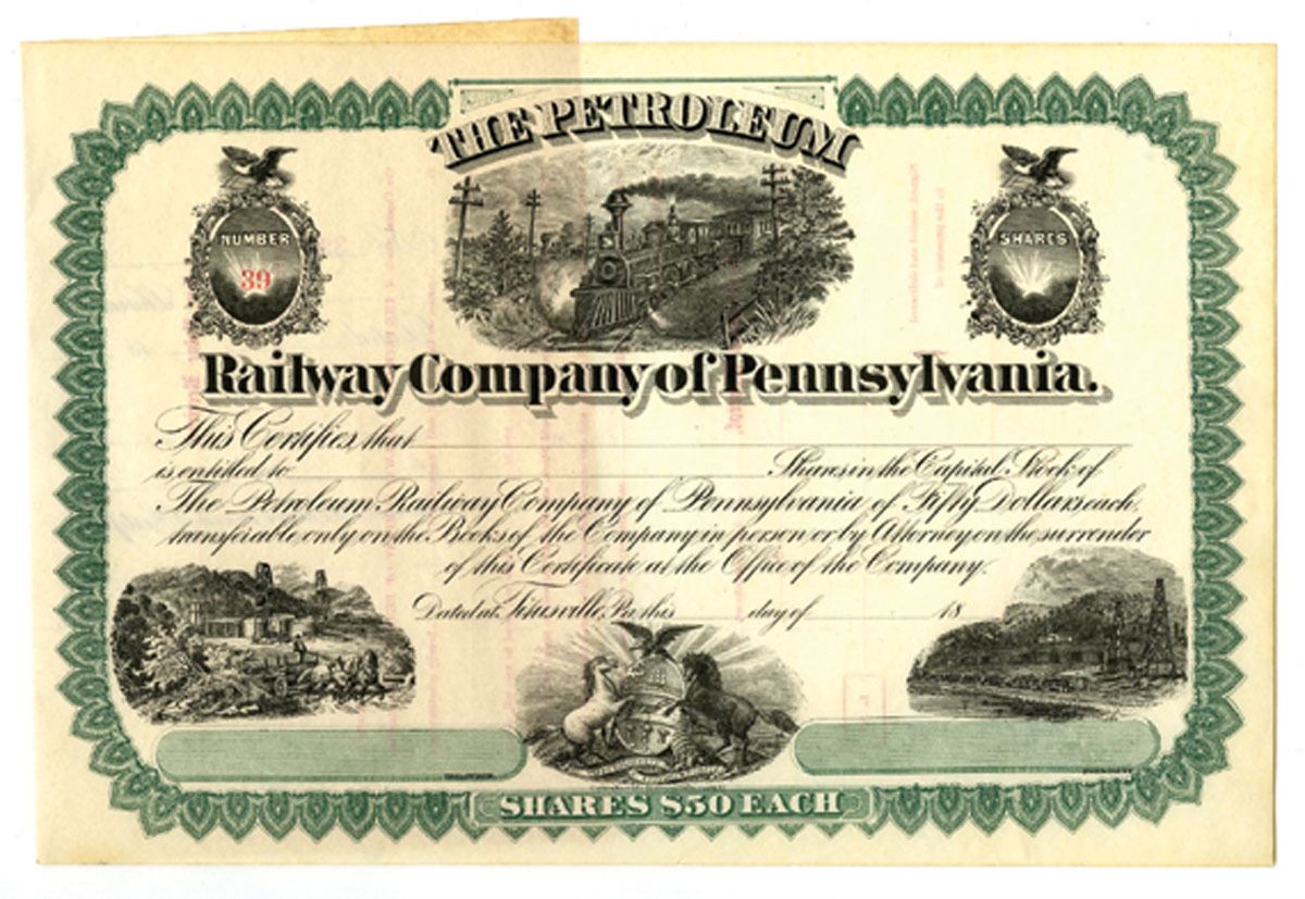 Titusville, Pennsylvania, ND (ca.1860s). Capital Stock U/U Certificate, Black print with green border, Locomotive rounding bend at top center with arms of PA at bottom center flanked on either side by oil vignettes, S/N 39, VF to XF condition with minor toning at edges. Corlies, Macy & Co.