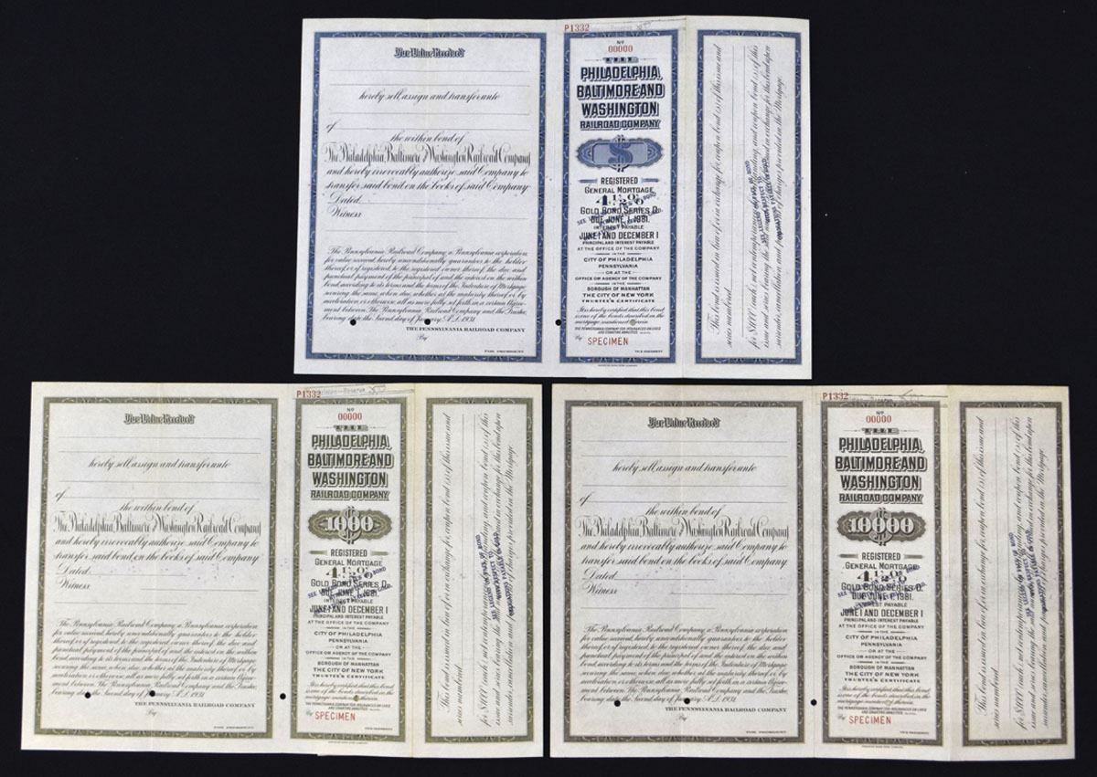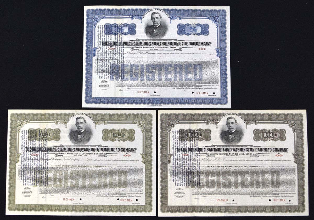 Pennsylvania, Delaware, & Maryland, 1931. Lot of 3 Registered 4 1/2% Specimen General Mortgage Series D Gold Bonds in varying colors and denominations, All have Specimen overprints, POCs, are in XF to AU condition, and printed by ABNC. All have the clause going off the "Gold Standard" on the left side of each. All rare. (3). Sold "AS IS" no returns accepted.