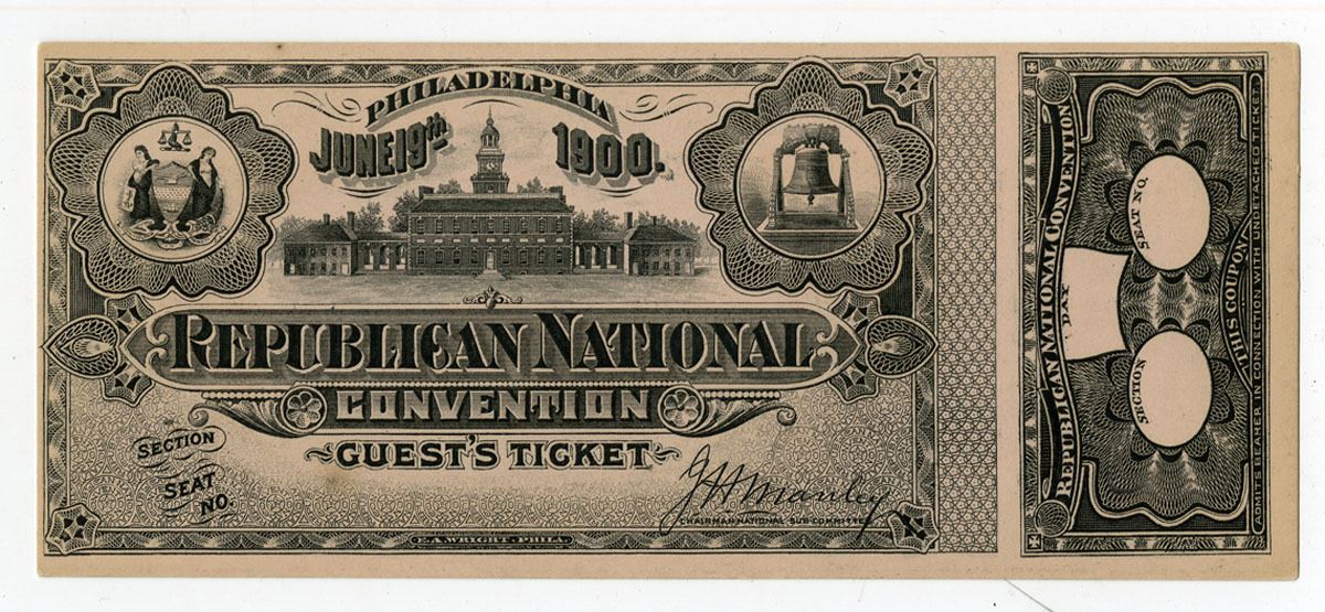 Philadelphia, Pennsylvania, 1900. Unissued (possibly a Specimen) Guest's Ticket to the June 19th, 1900 Republican National Convention. Black text on off-pink paper, Independence Hall depicted at top center flanked by Pennsylvania's Coat of Arms and the Liberty Bell. The 1900 Republican National Convention was held June 19 to June 21 in the Exposition Auditorium, Philadelphia, Pennsylvania. The Exposition Auditorium was located south of the University of Pennsylvania, and the later Convention Hall was constructed along the building's east wall. It was demolished in 2006. President William McKinley was unanimously nominated for reelection: no candidate ran against him, although Admiral George Dewey considered a run. Governor Theodore Roosevelt of New York, who was himself a delegate, was nominated for vice president by a vote of 925 to zero, his vote alone abstaining. Printer: E.A. Wright,