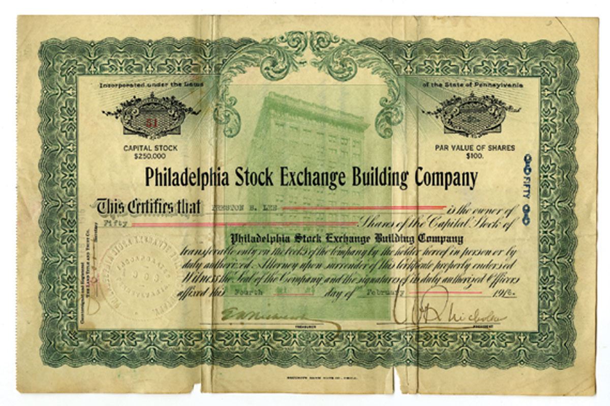Philadelphia, Pennsylvania, 1916. 50 Shares Capital Stock I/U Certificate, Black print on green border and building as underprint in green, S/N 51, Certificate is in VF condition with folds an minor faults. SBNC. The Philadelphia Stock Exchange Building Company was incorporated in 1916 to construct and manage a permanent headquarters for the Philadelphia Stock Exchange (PHLX) — one of the oldest stock exchanges in the United States, founded in 1790. The company’s purpose was strictly real-estate focused: it financed, owned, and maintained the building that would house the Exchange and related tenants. By the early 20th century, the Philadelphia Stock Exchange had outgrown its prior facilities and sought a modern structure befitting its growing importance in American finance. The Philadelphia Stock Exchange Building Co. was organized to raise capital through the issuance of stock (like the 1916 certificate in question) and to oversee construction.