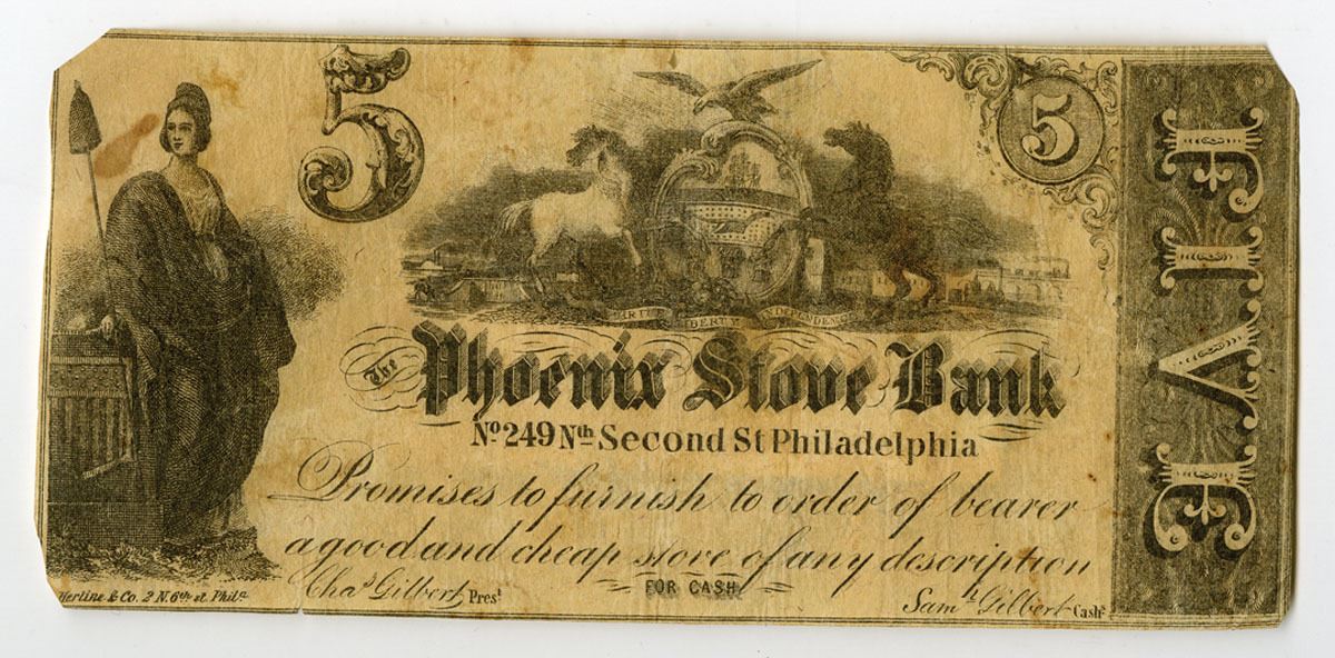 Philadelphia, Pennsylvania, ND (1860s). $5 look-a-like Obsolete Advertising Note, Black printing with Standing allegorical Liberty at left and arms of Pennsylvania at top center, VF condition with corner tips missing, Sam Gilbert Printers.