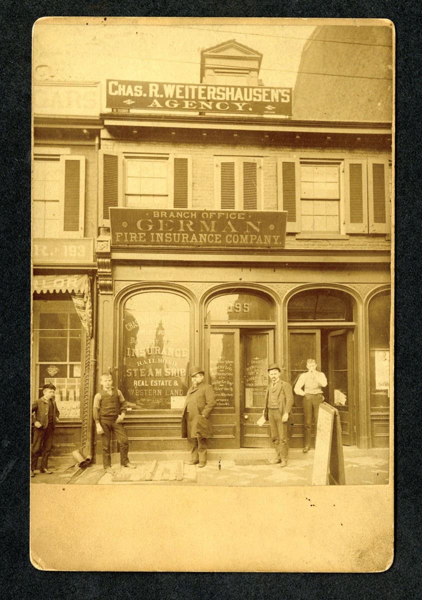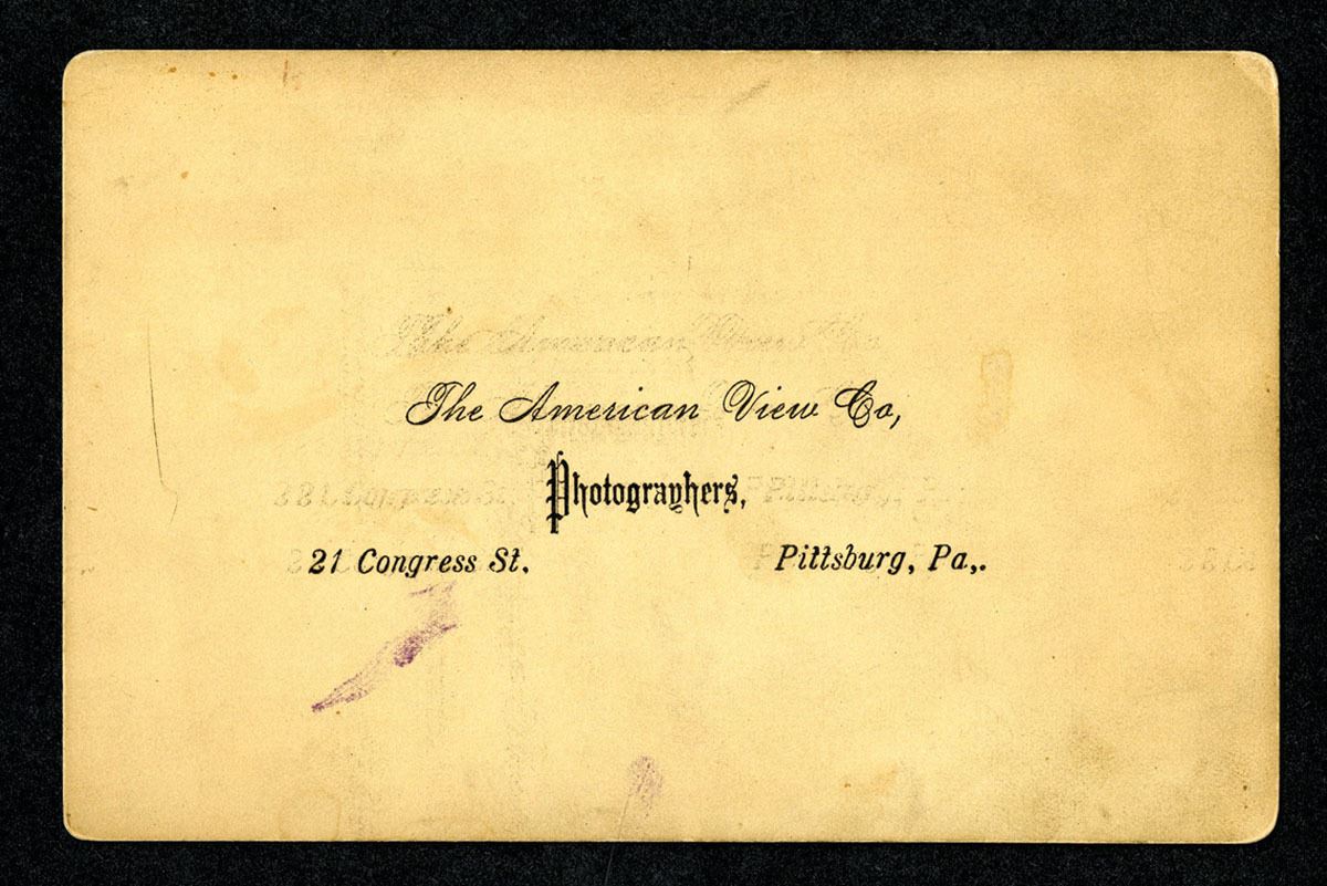 Pennsylvania, Pittsburgh. Agent for German Fire Insurance Co. and Steamship tickets. 5-1/2 x 4 inch photo mounted on slightly larger card. American View Co. Pittsburgh imprint on back. Nice.